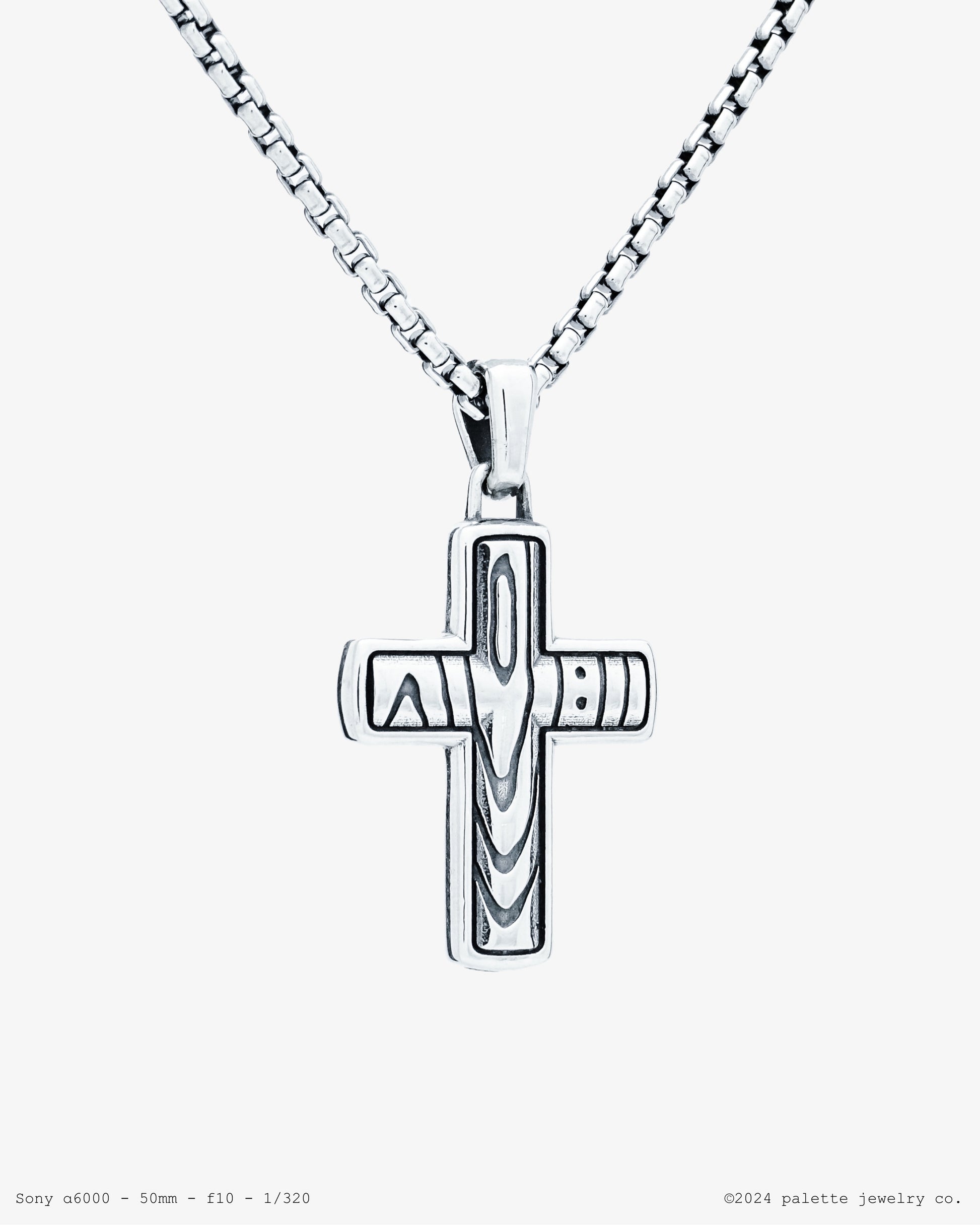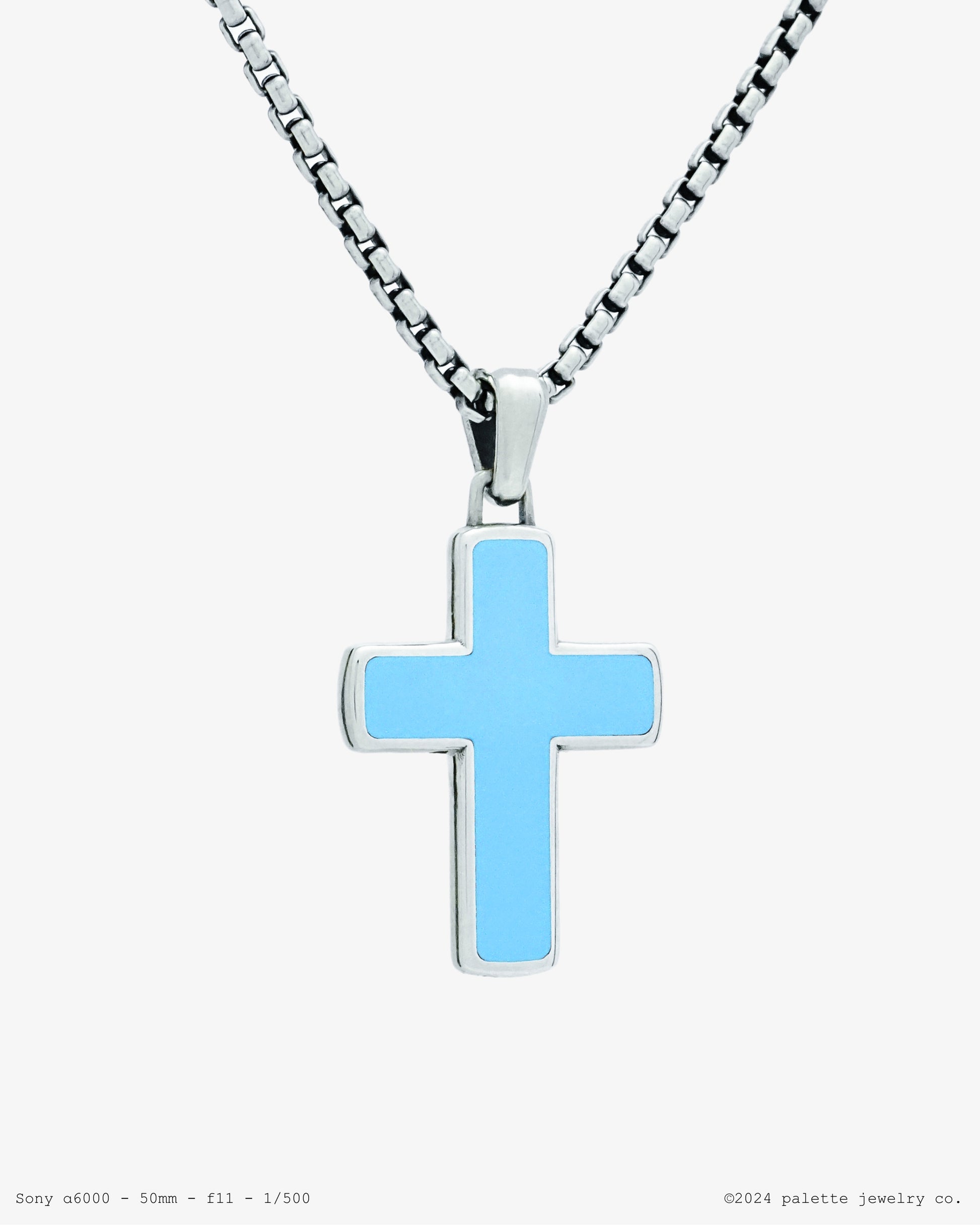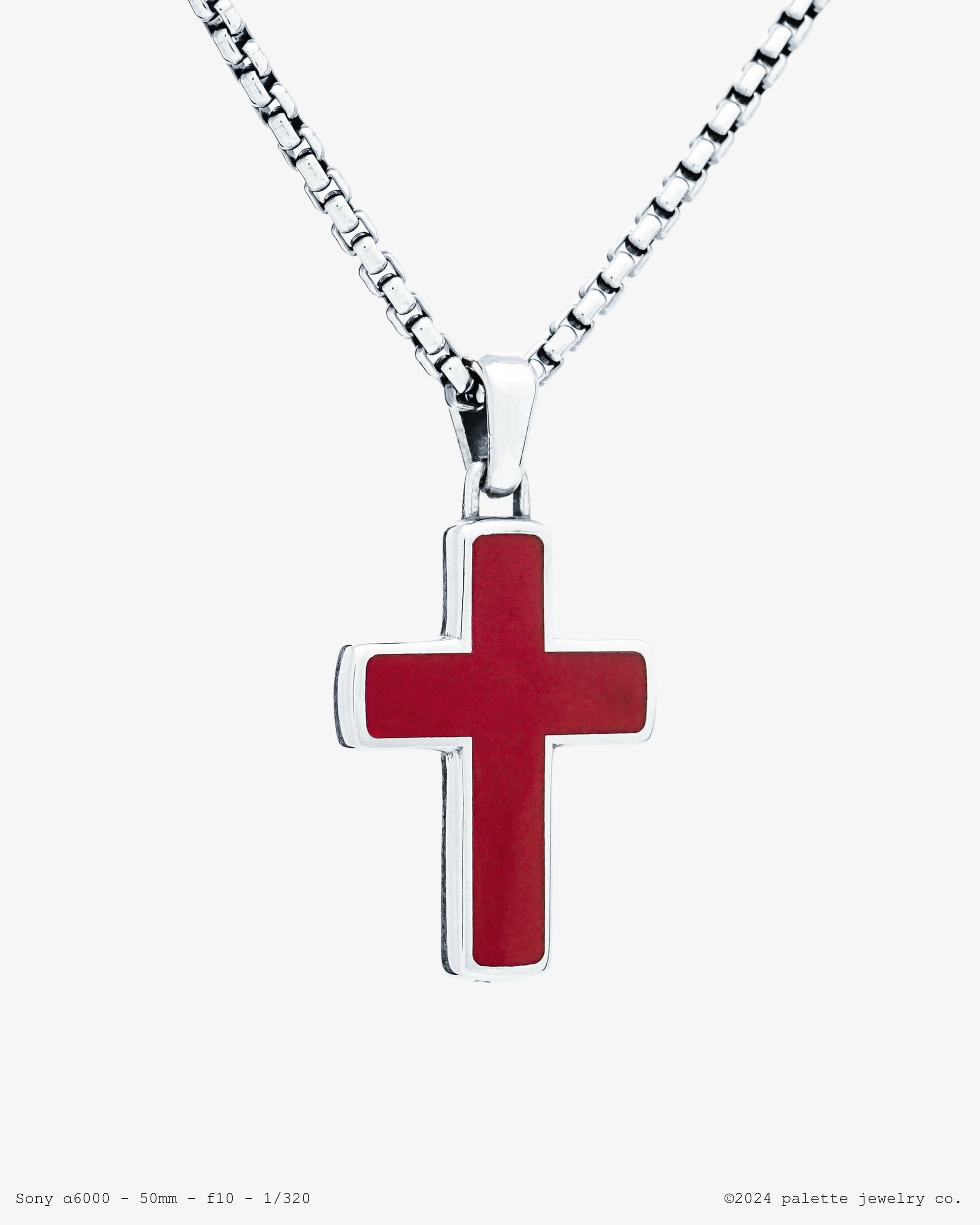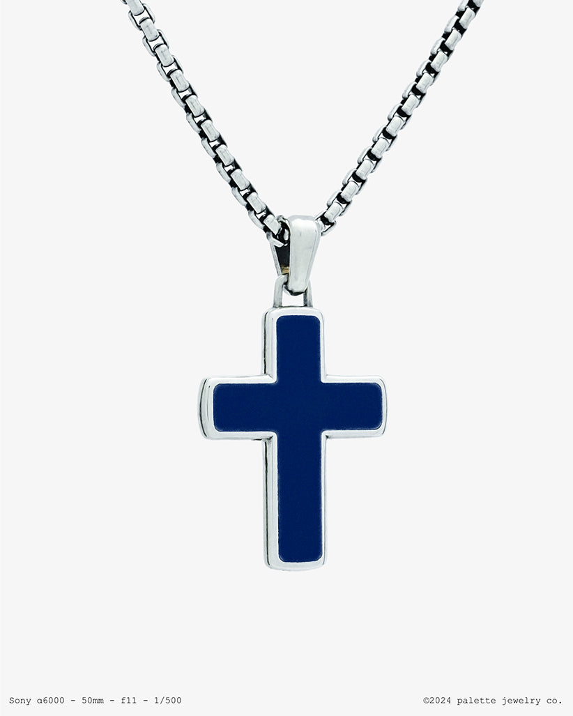 Sterling silver and kiln-fired enamel inlay cross. Palette signature wood grain motif back. Handcrafted in Rhode Island.