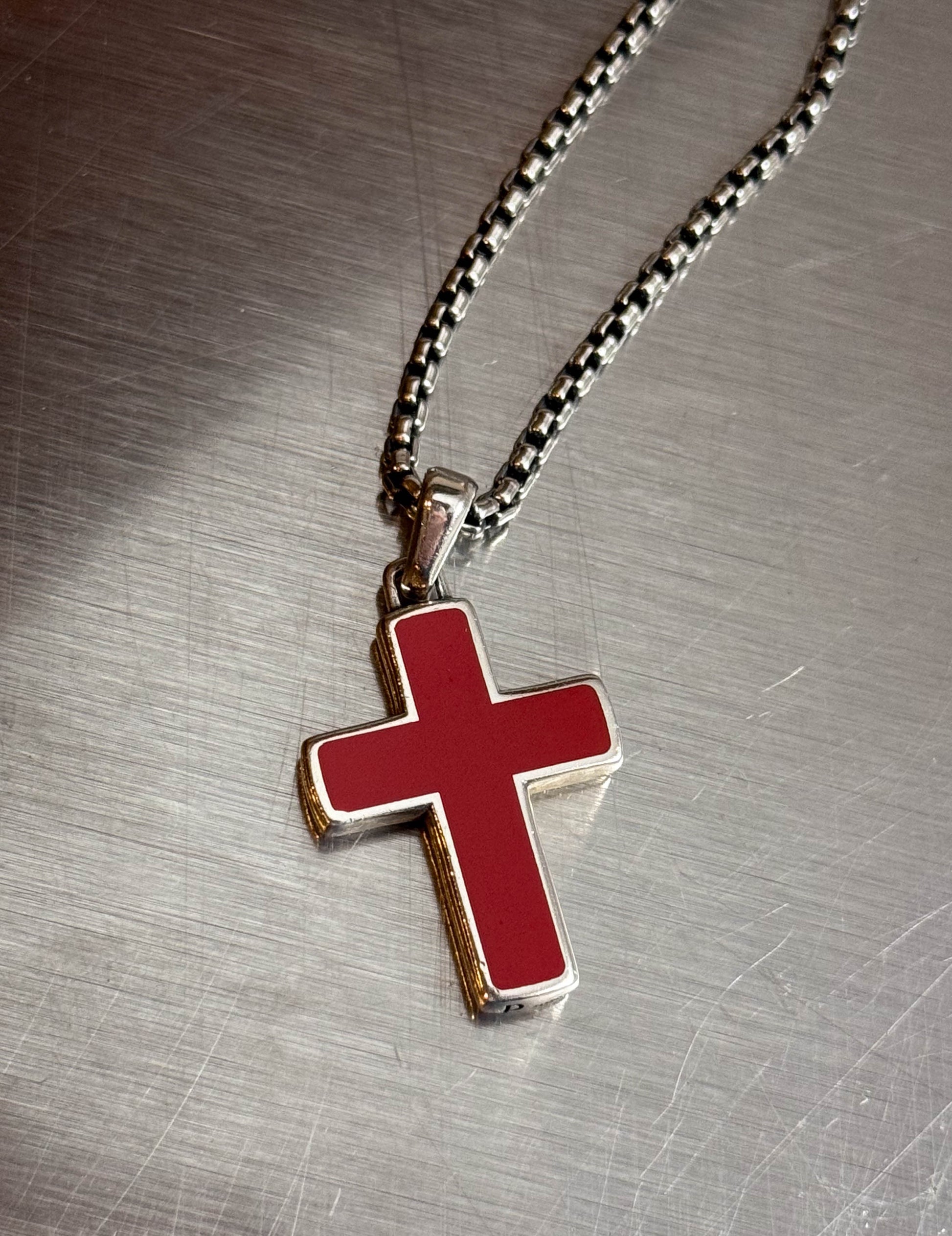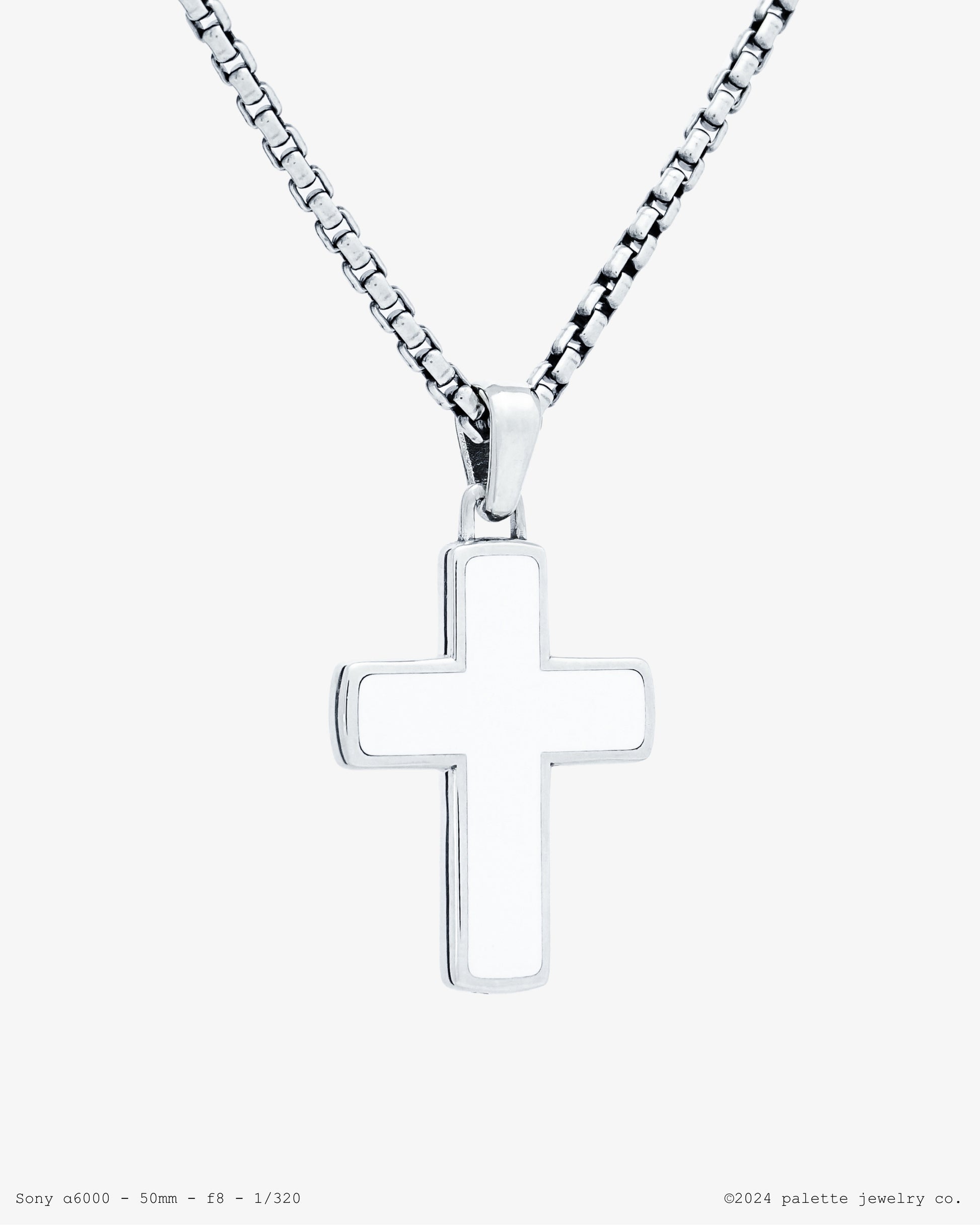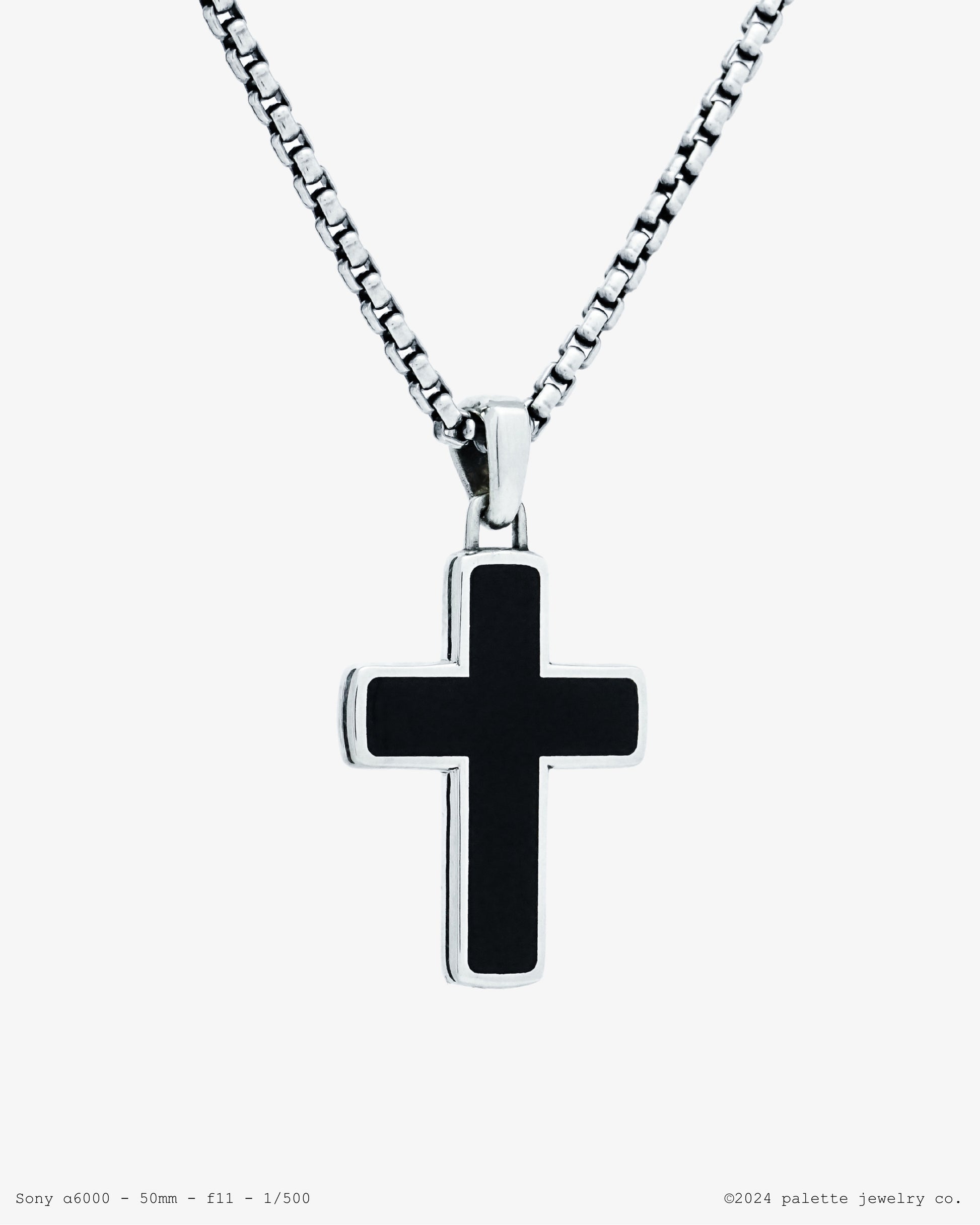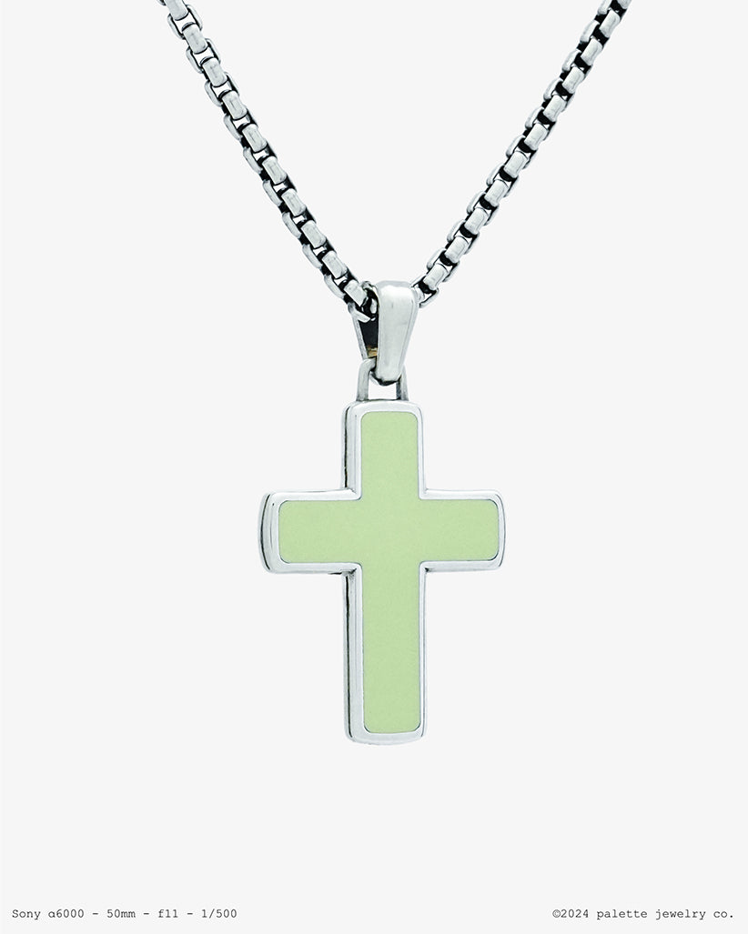 Sterling silver and kiln-fired enamel inlay cross. Palette signature wood grain motif back. Handcrafted in Rhode Island.