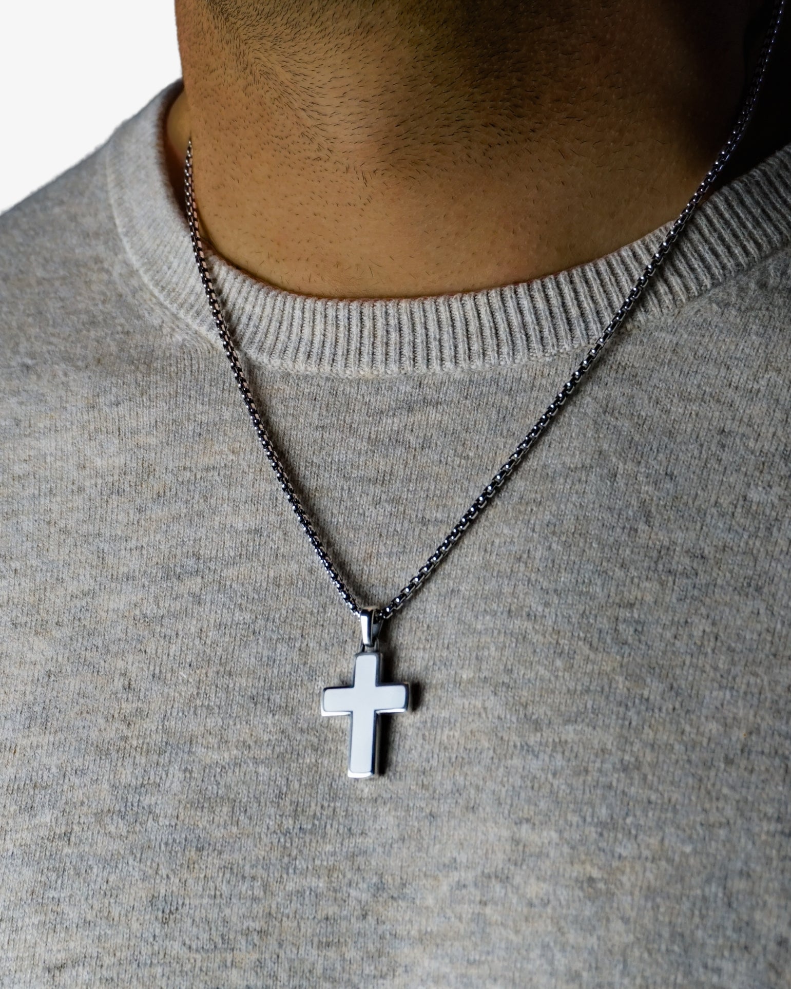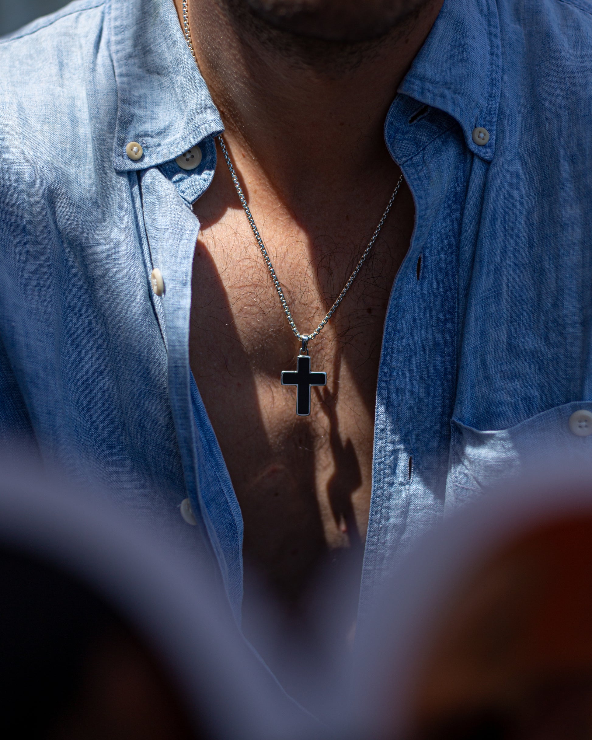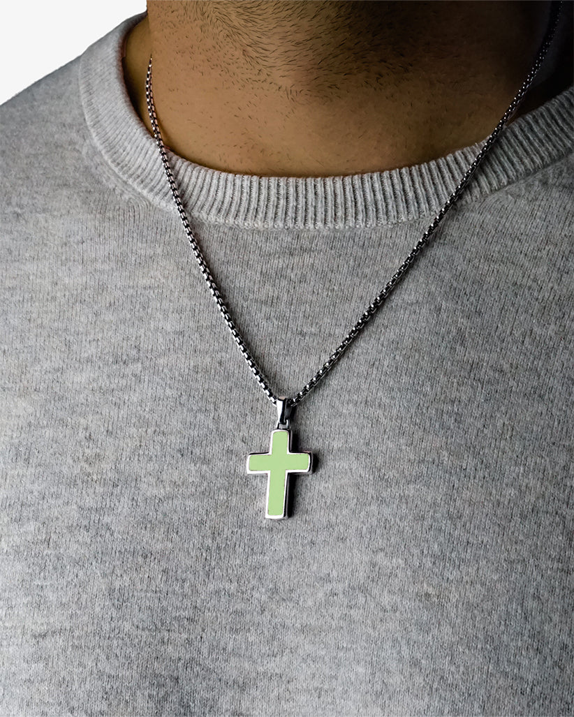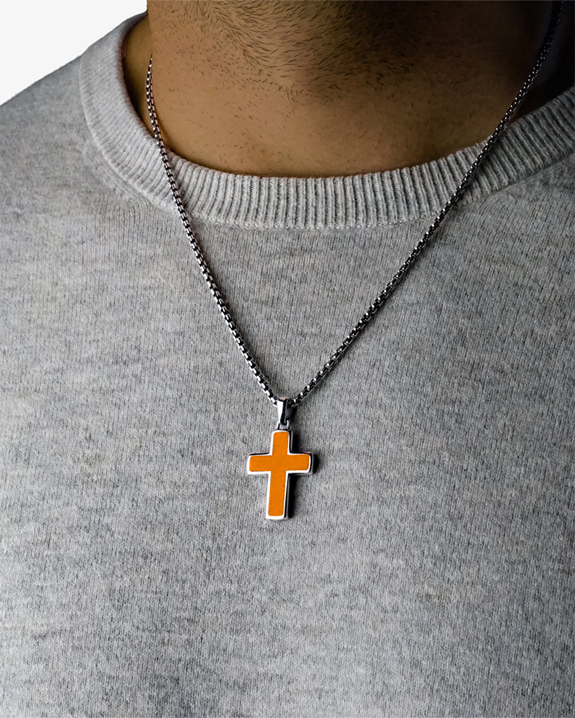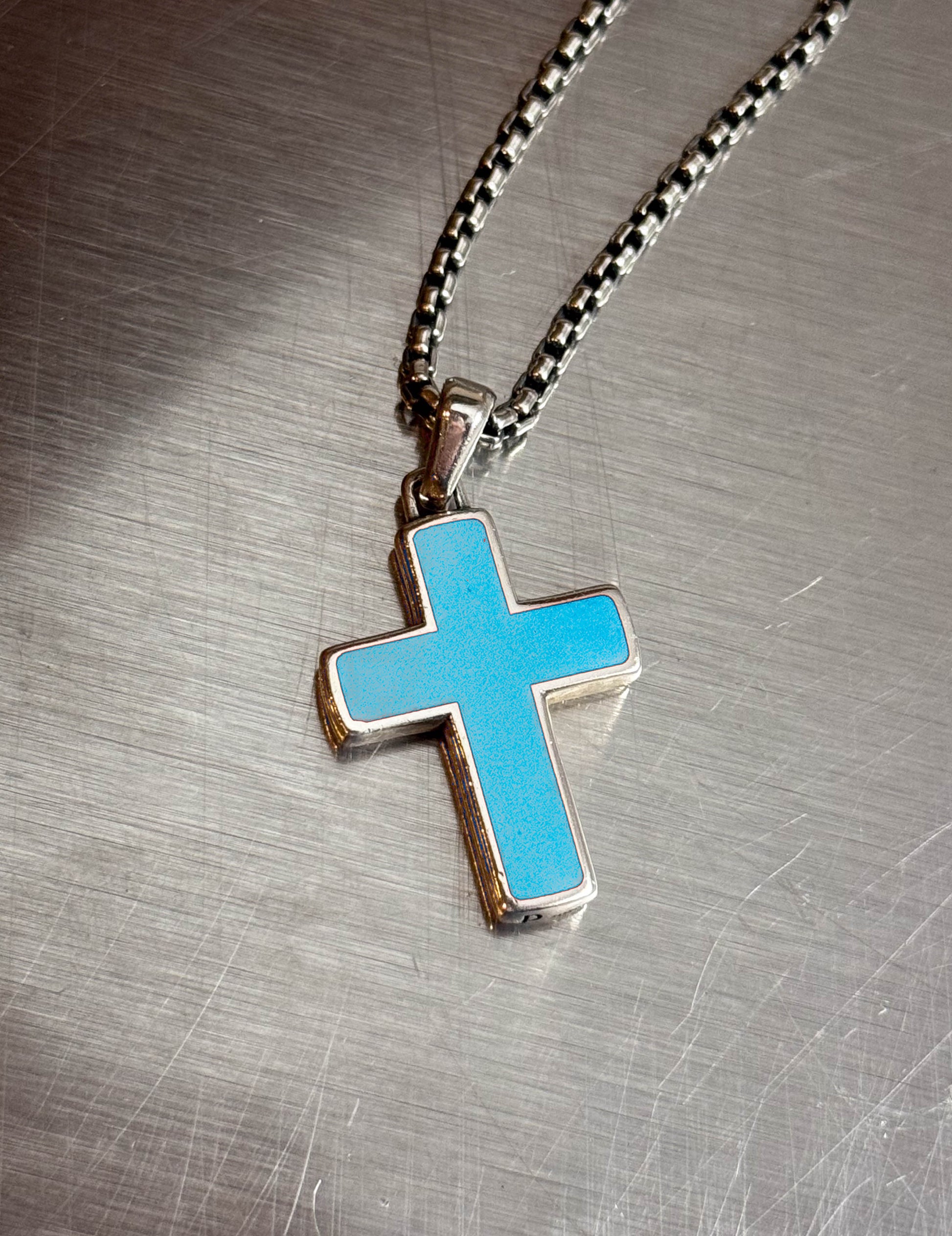 Sterling silver and kiln-fired enamel inlay cross. Palette signature wood grain motif back. Handcrafted in Rhode Island.